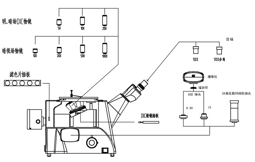 粗微动同轴调焦,带锁紧和限位装置,微动格值:2.0μm.